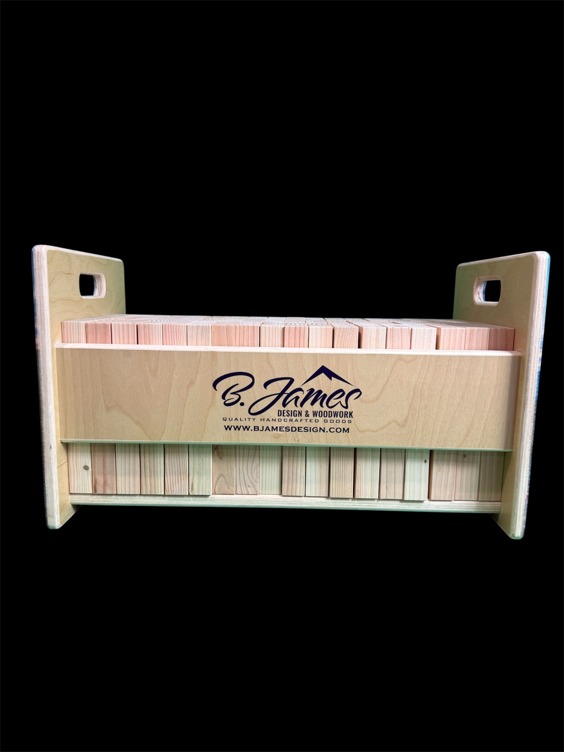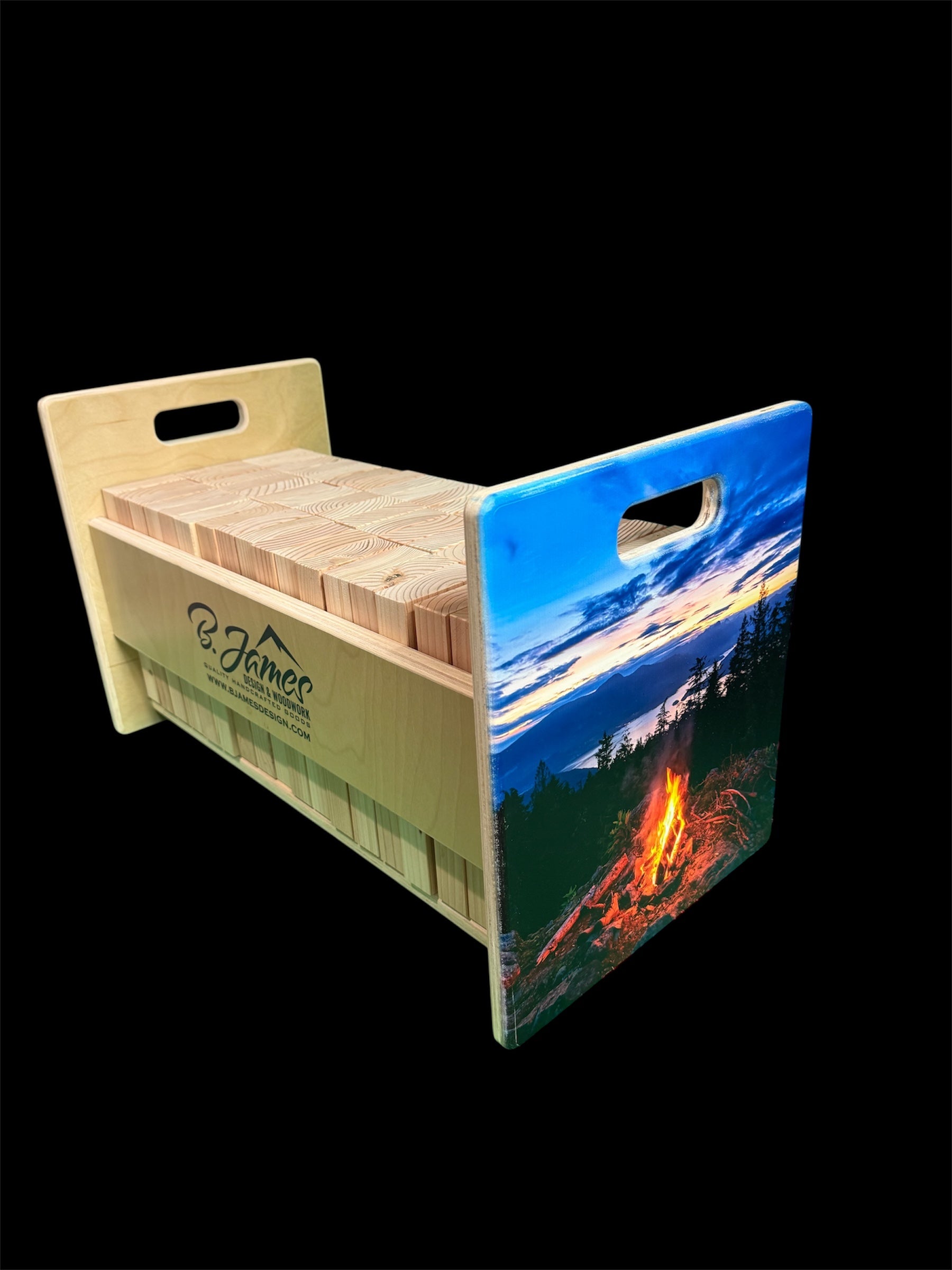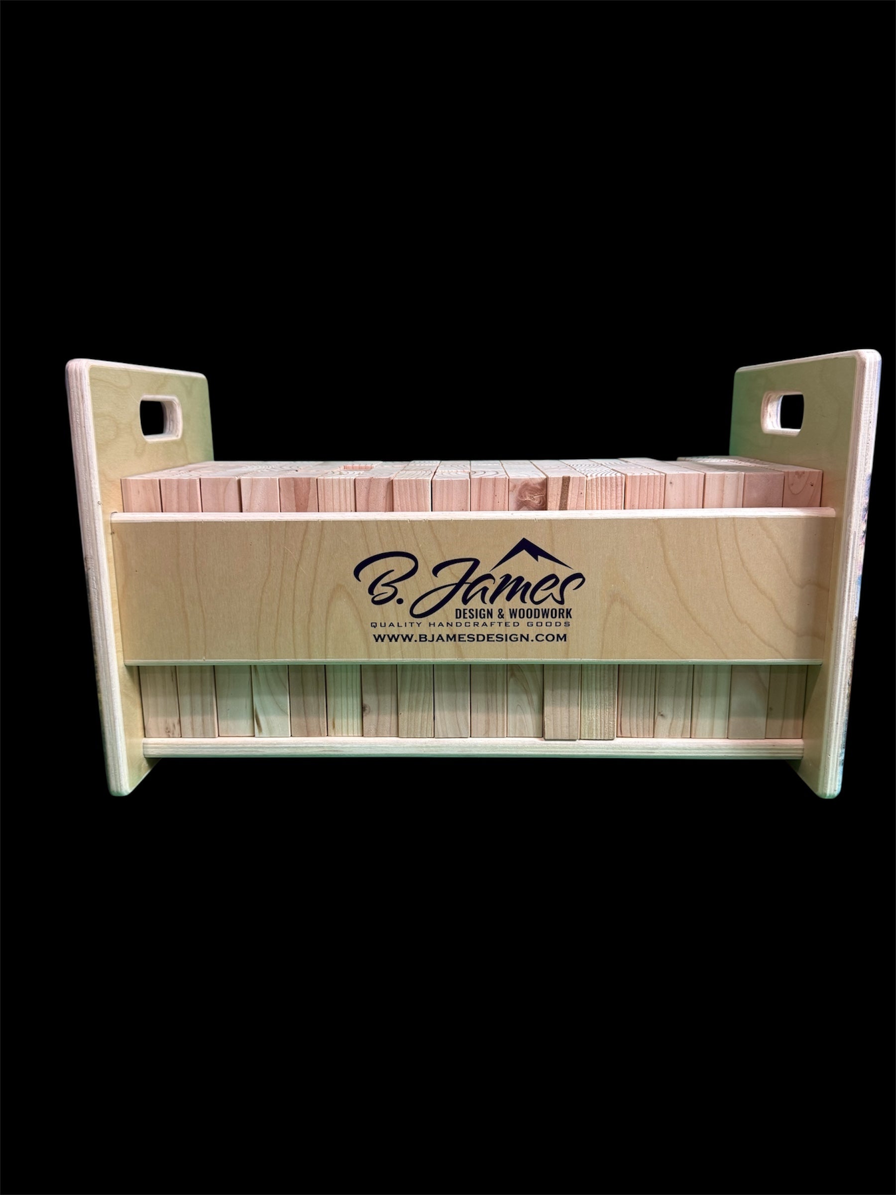 This giant tumbling tower game is fun for the entire family. Each of the 54 blocks is 3"x9". The blocks nest into a tote that has high resolution graphics. The tote also has rubber feet on one side to allow it to double as a table for playing the game on.