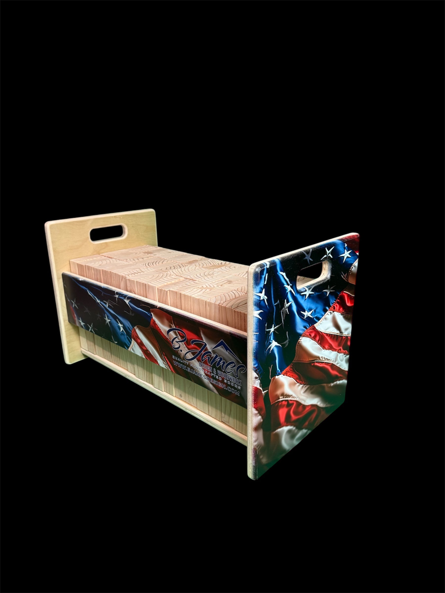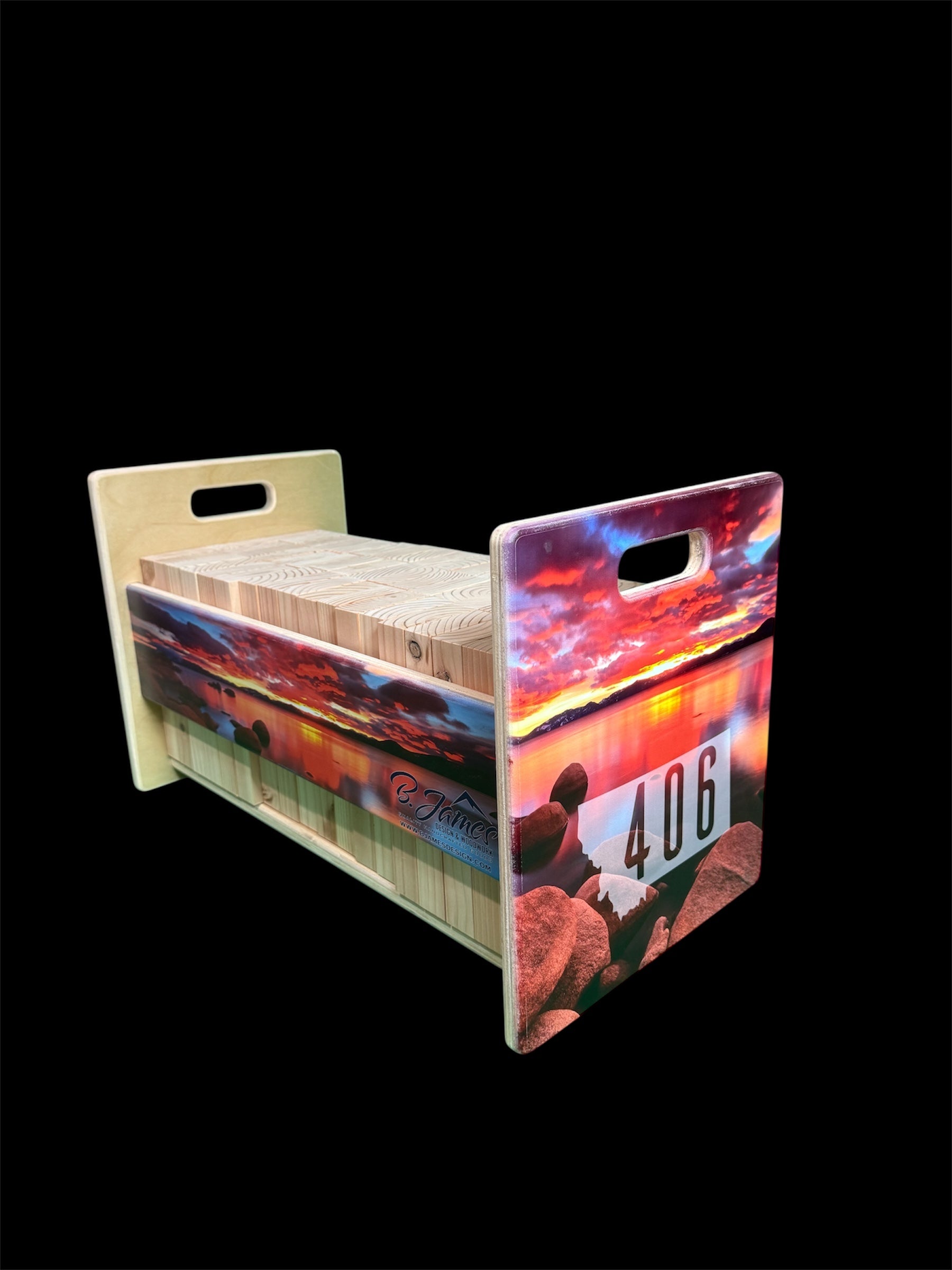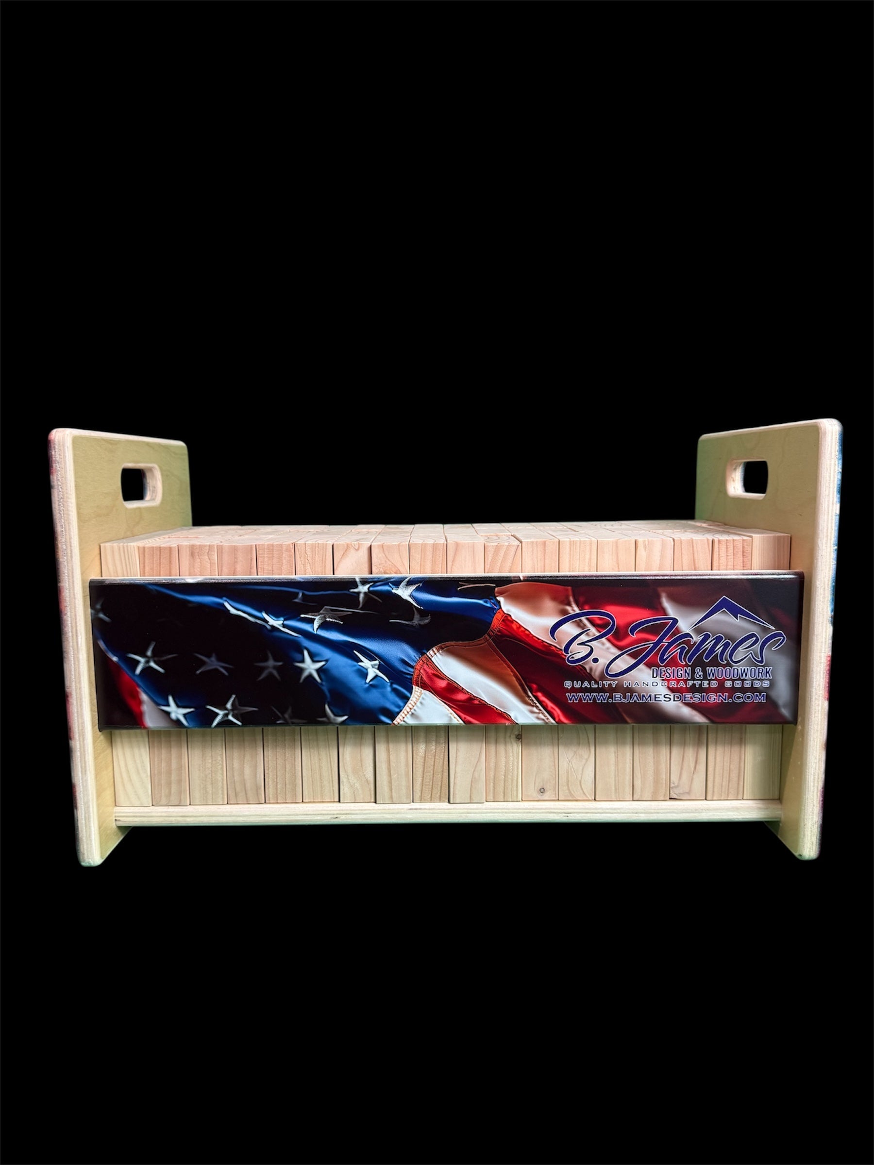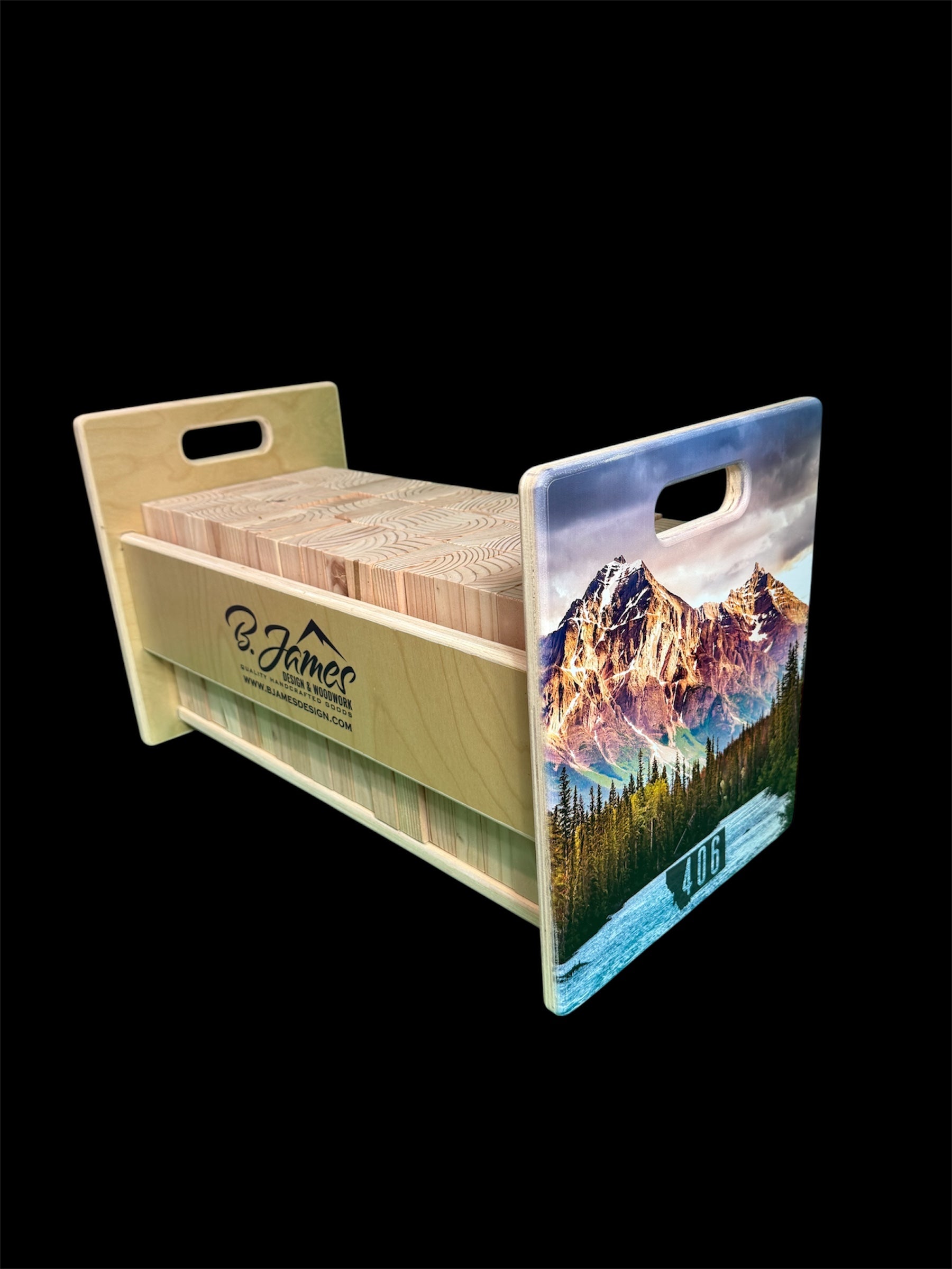 This giant tumbling tower game is fun for the entire family. Each of the 54 blocks is 3"x9". The blocks nest into a tote that has high resolution graphics. The tote also has rubber feet on one side to allow it to double as a table for playing the game on.